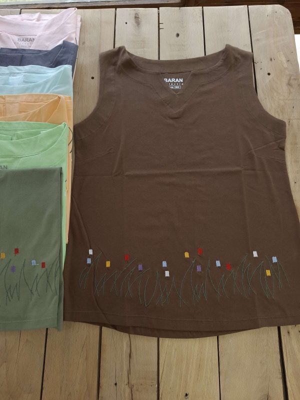با این تی شرت بدون آستین به یک ظاهر شیک و طبیعی دست پیدا کنید. این تی شرت با طراحی منحصر به فرد و دوزی دستی (یا ماشینی با کیفیت بالا) از خطوط شبیه چمن و گلهای رنگی، یک اثر هنری روی پارچه به شمار میره. رنگ صورتی روشن این تی شرت، حسی نرم و ملایم به ظاهر شما میده و با همه لباسها هماهنگی عالی داره.