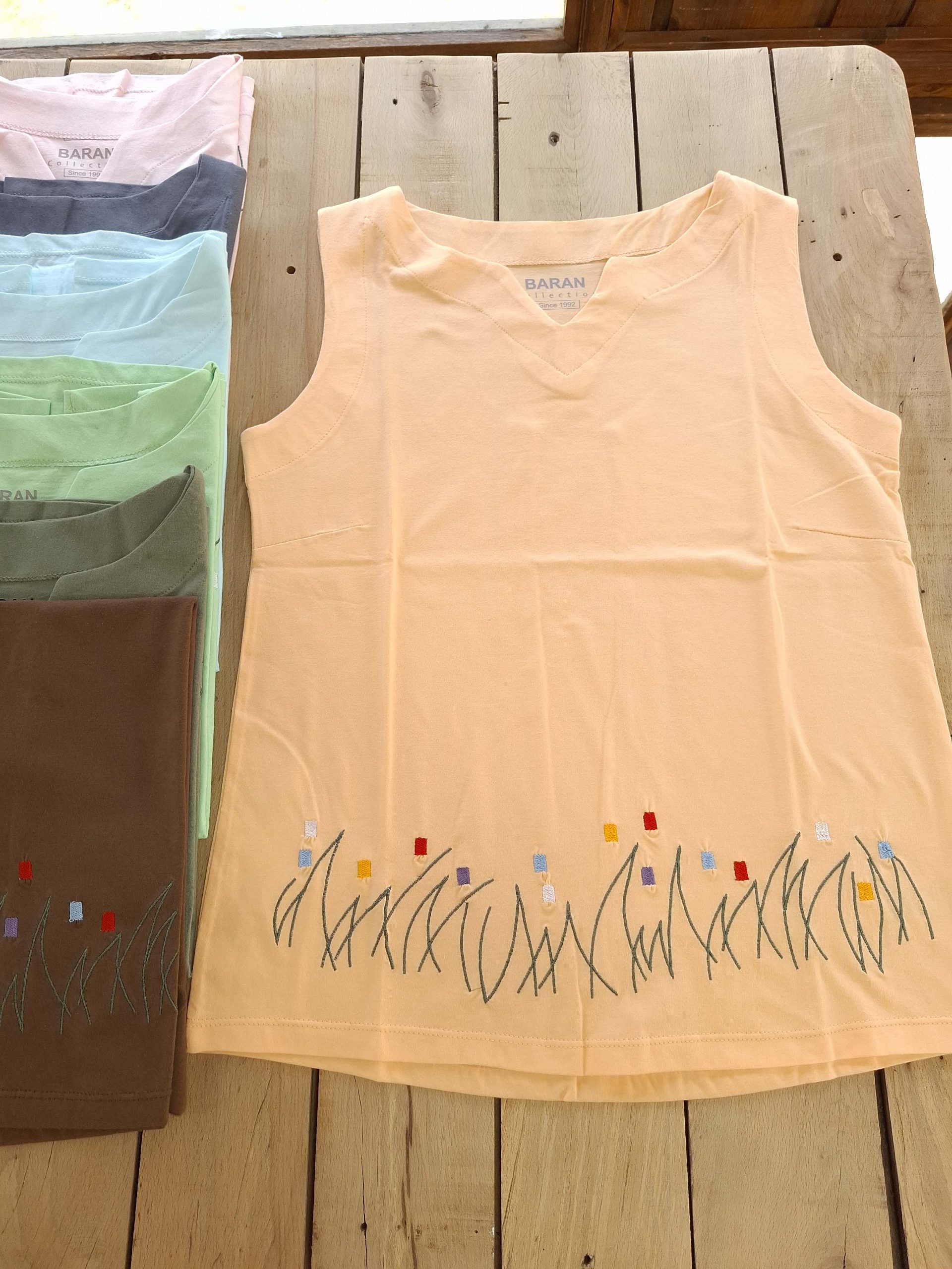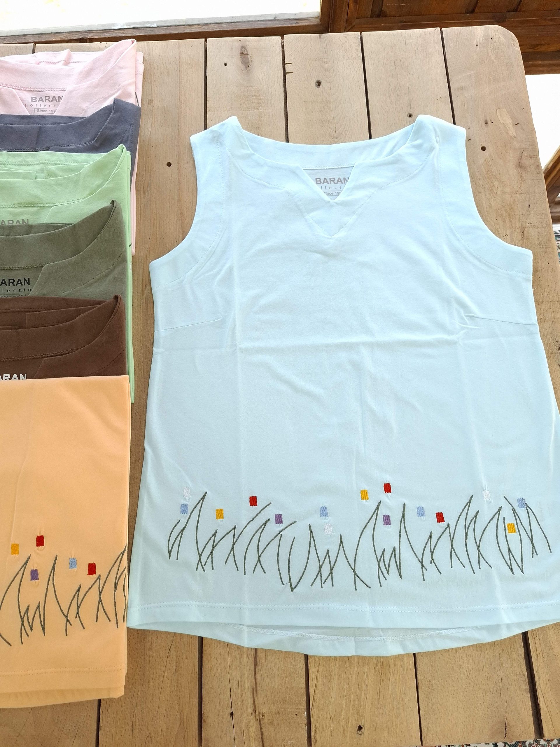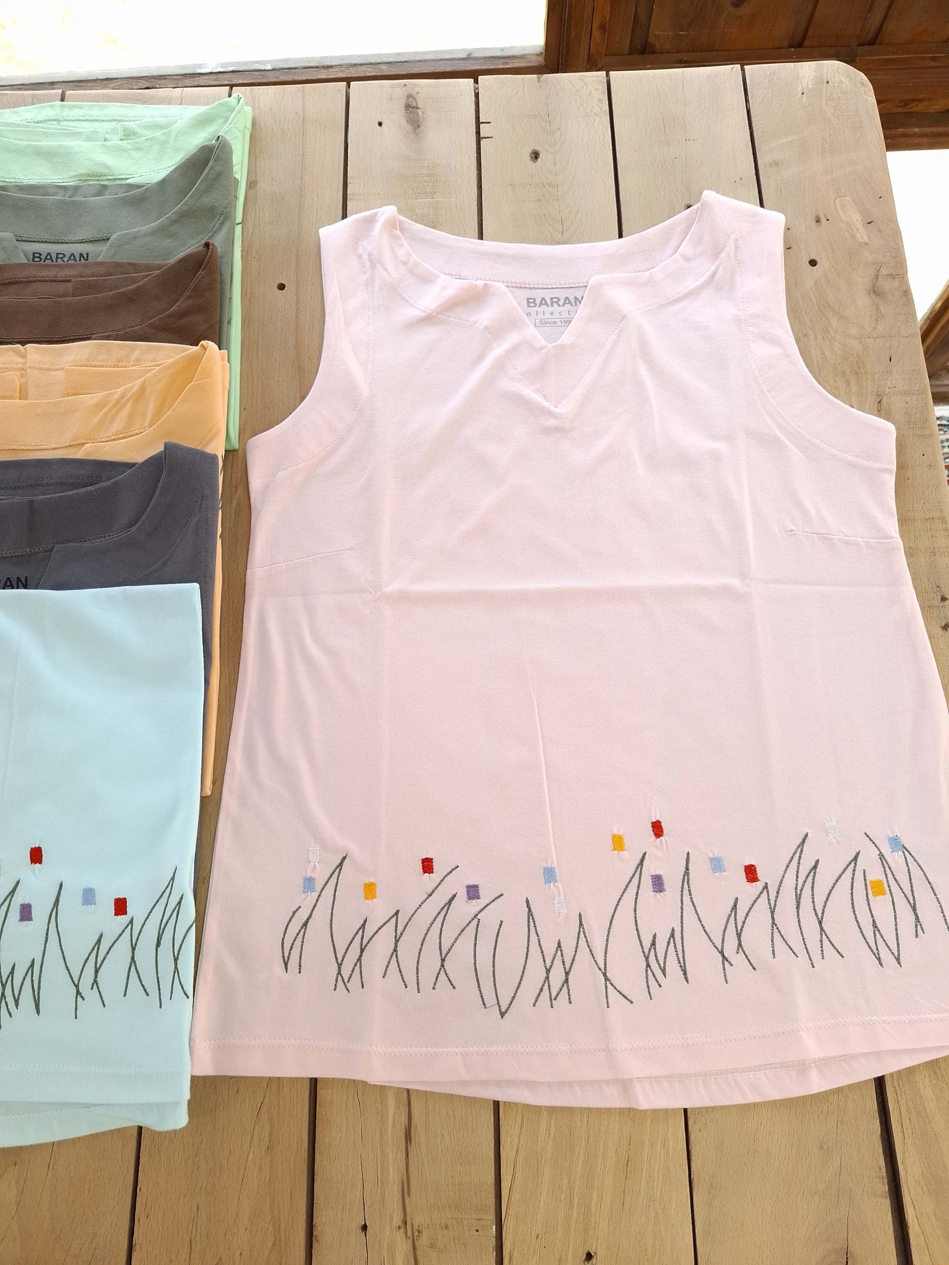 با این تی شرت بدون آستین به یک ظاهر شیک و طبیعی دست پیدا کنید. این تی شرت با طراحی منحصر به فرد و دوزی دستی (یا ماشینی با کیفیت بالا) از خطوط شبیه چمن و گلهای رنگی، یک اثر هنری روی پارچه به شمار میره. رنگ صورتی روشن این تی شرت، حسی نرم و ملایم به ظاهر شما میده و با همه لباسها هماهنگی عالی داره.
