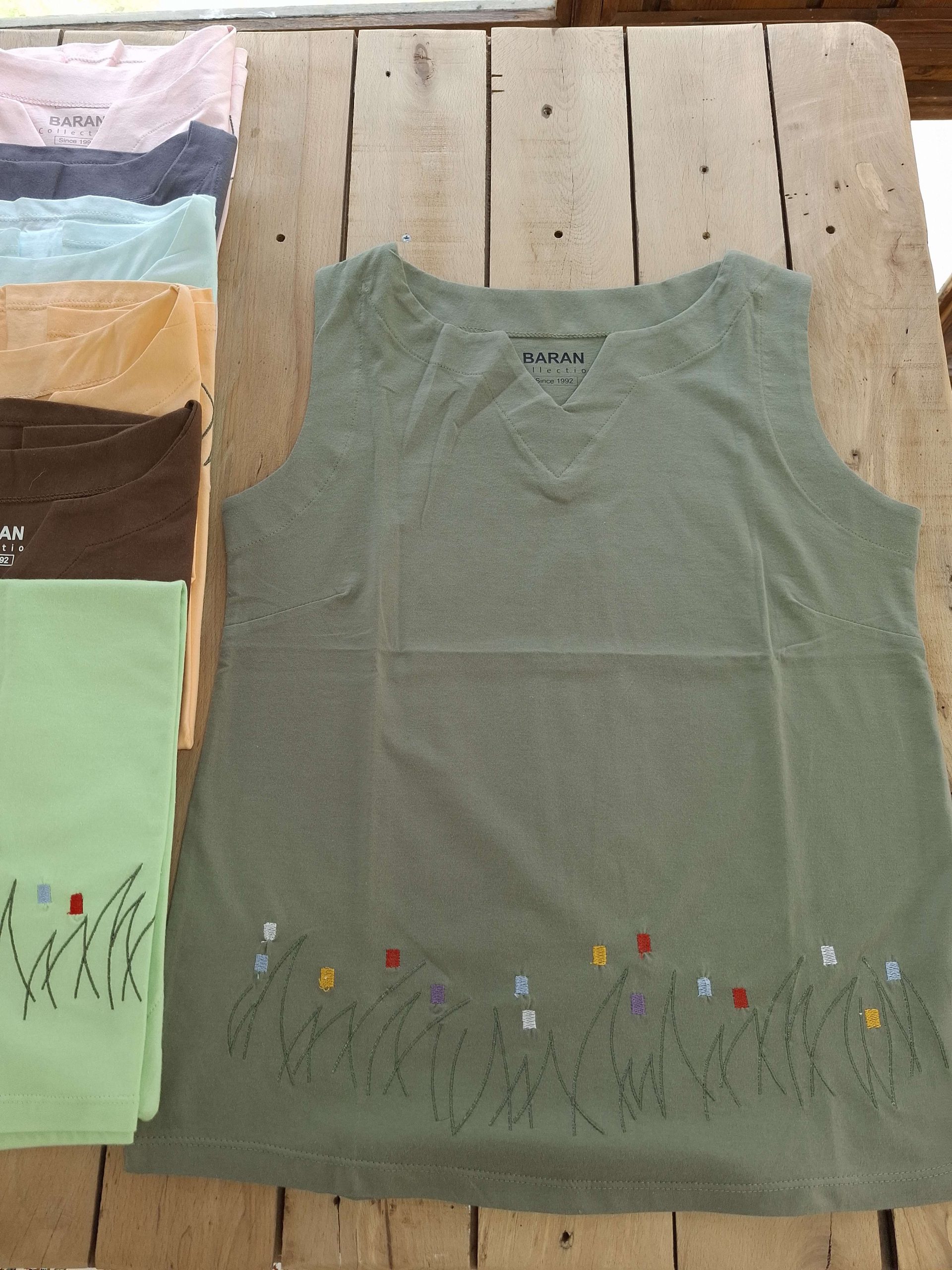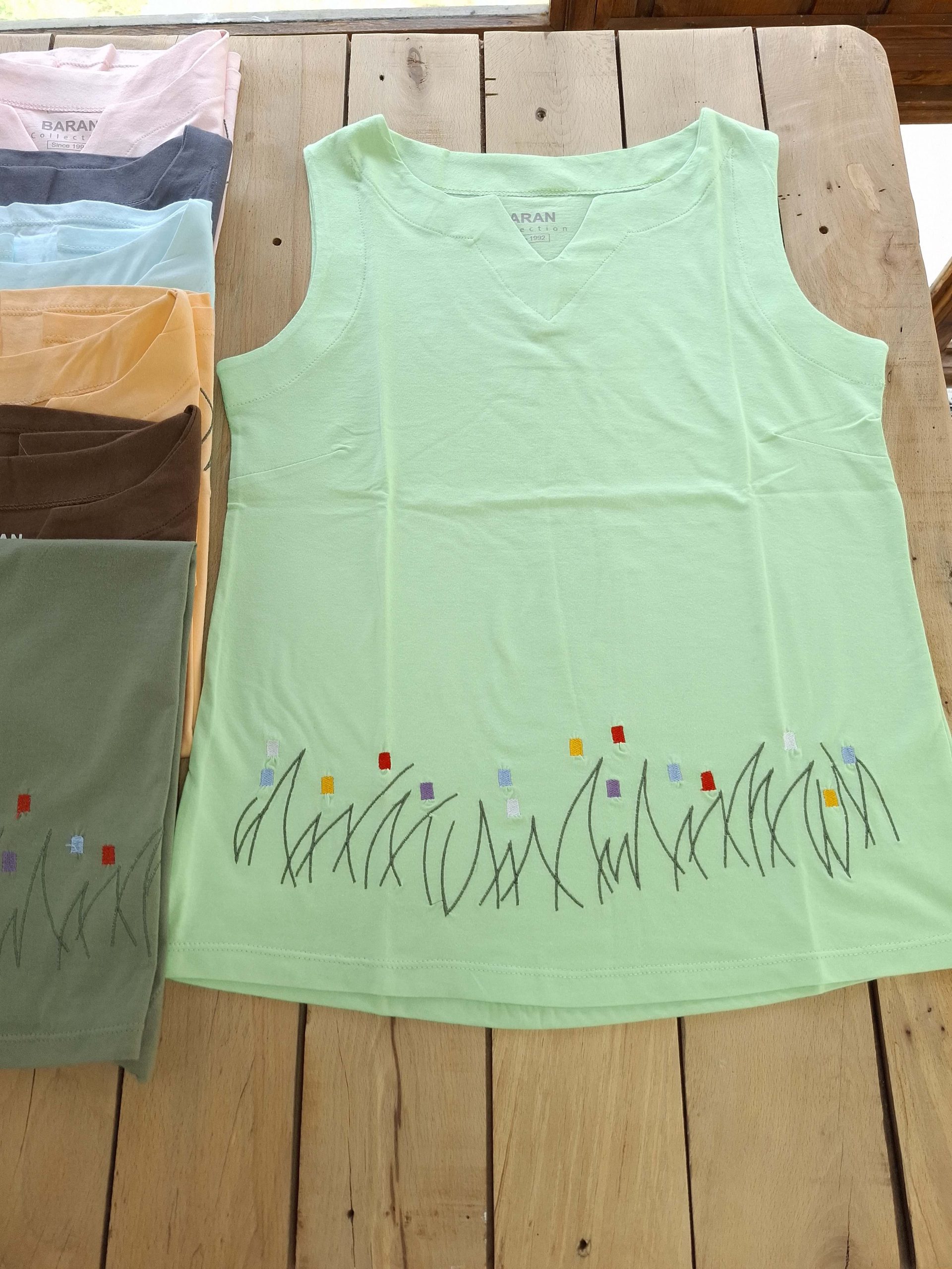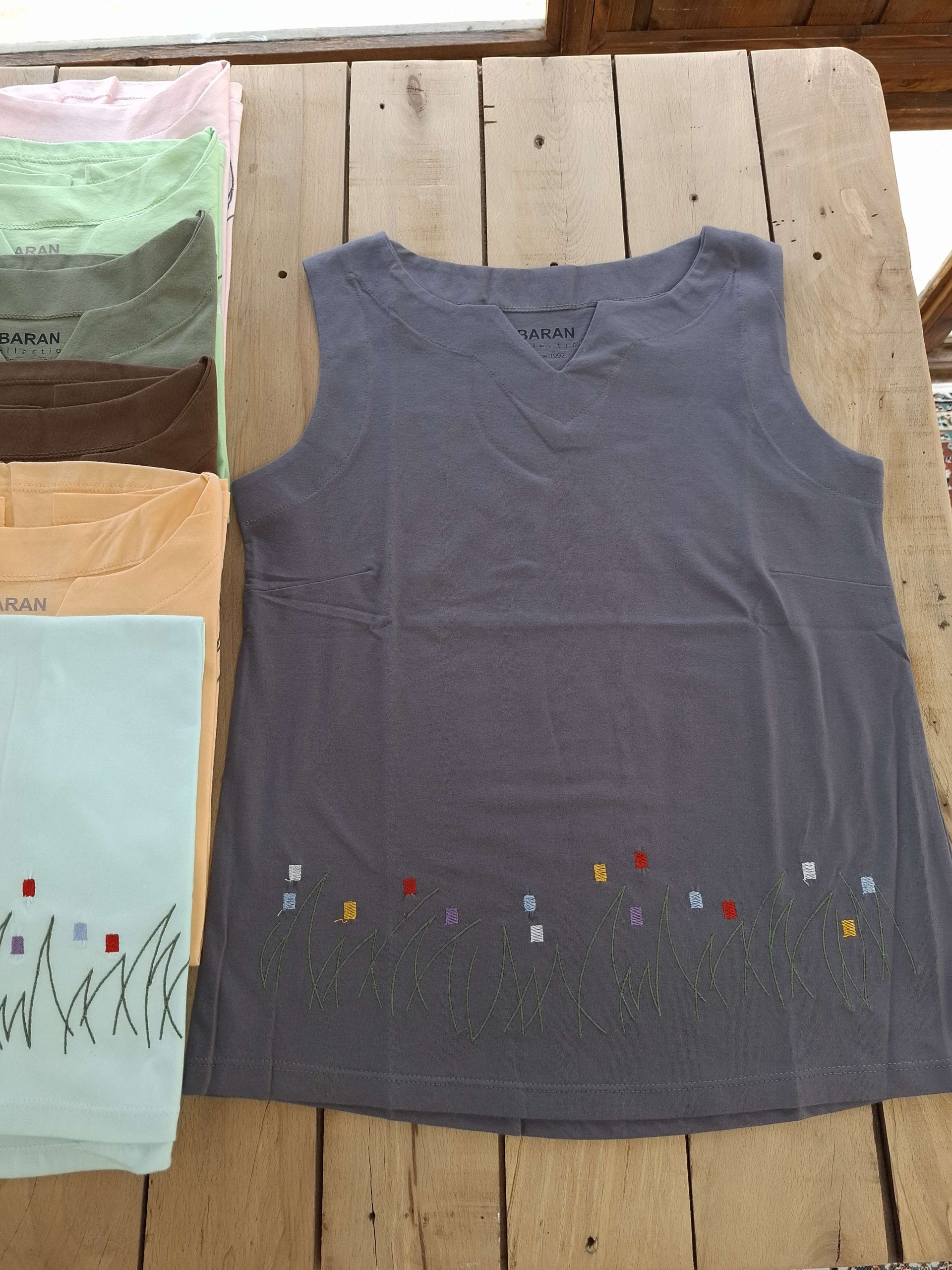 با این تی شرت بدون آستین به یک ظاهر شیک و طبیعی دست پیدا کنید. این تی شرت با طراحی منحصر به فرد و دوزی دستی (یا ماشینی با کیفیت بالا) از خطوط شبیه چمن و گلهای رنگی، یک اثر هنری روی پارچه به شمار میره. رنگ صورتی روشن این تی شرت، حسی نرم و ملایم به ظاهر شما میده و با همه لباسها هماهنگی عالی داره.