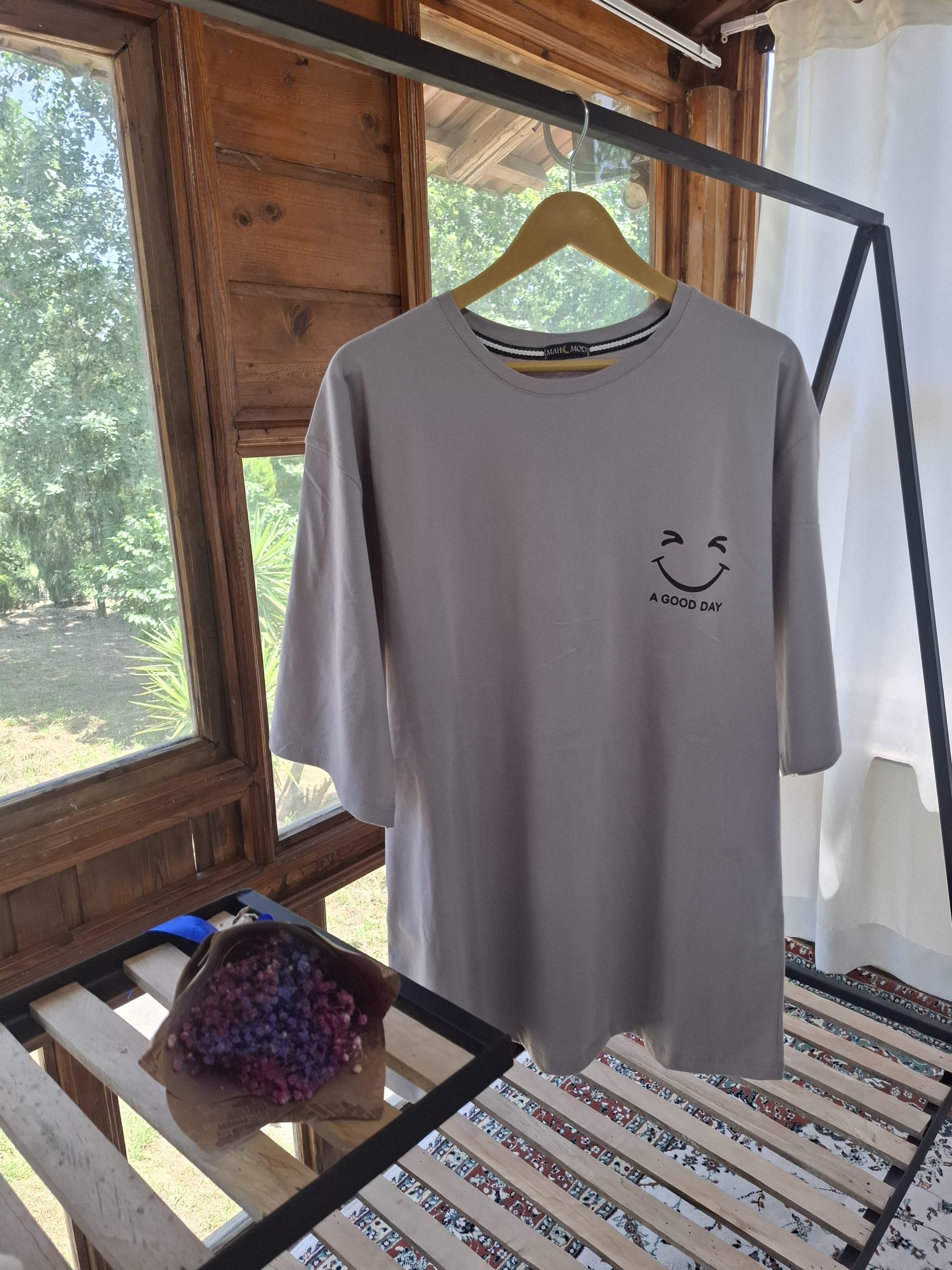 طرح: گرافیک ساده و شیک روی سینه با عبارت A GOOD DAY و یک صورتک خندان، که حس مثبت و دوستانه به استایل شما میدهد.