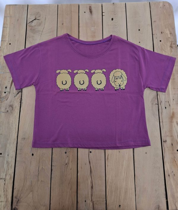 این کراپ فقط یک لباس نیست—یک حس است. حس سرزندگی و متفاوت بودن. طرح چهار گوسفند ساده و یک گوسفند خاص، پیام شیرین و خلاقانهای دارد: خودت باش، حتی اگر با بقیه فرق داری. رنگ بنفشِ شاد و پارچهی لطیفش هم باعث شده انتخابی ایدهآل برای روزهای پرانرژی ات باشد.